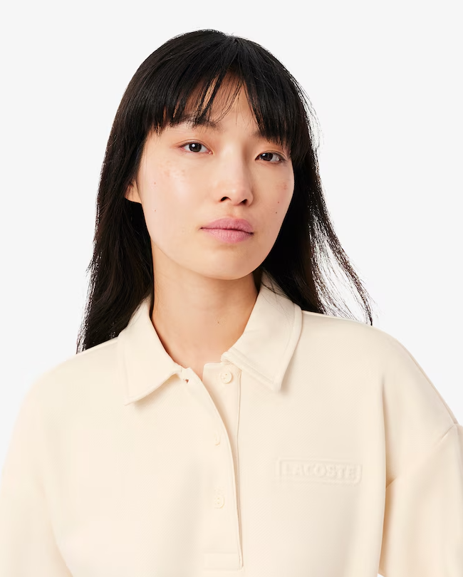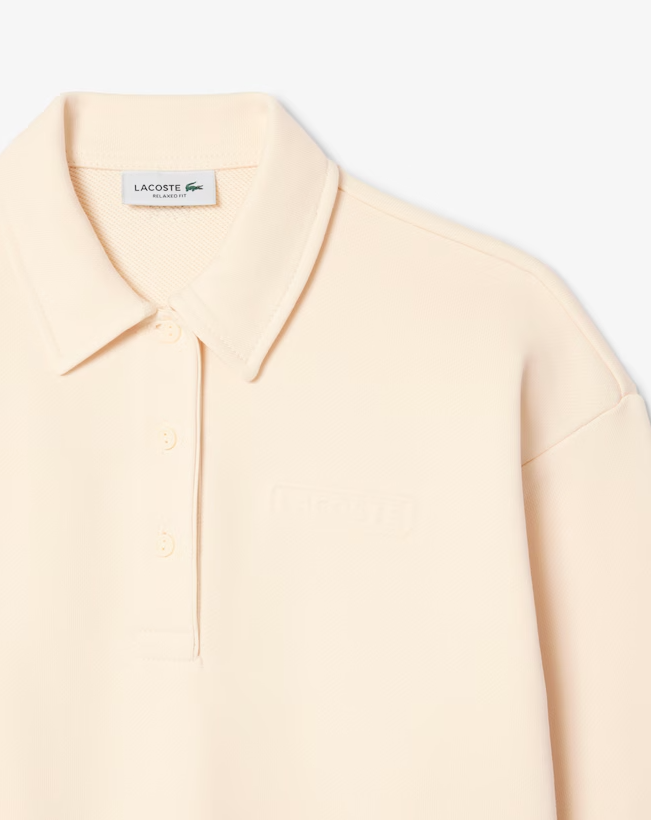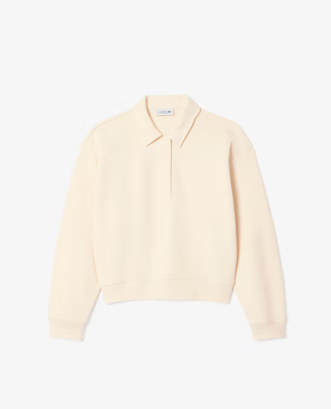 Um agasalho feminino com gola polo da Lacoste, criadora de roupas esportivas desde 1933. Confeccionado em tecido de lã de algodão com corte confortável, acabamento canelado, gola polo com abertura de botões e marca Lacoste em relevo no peito.